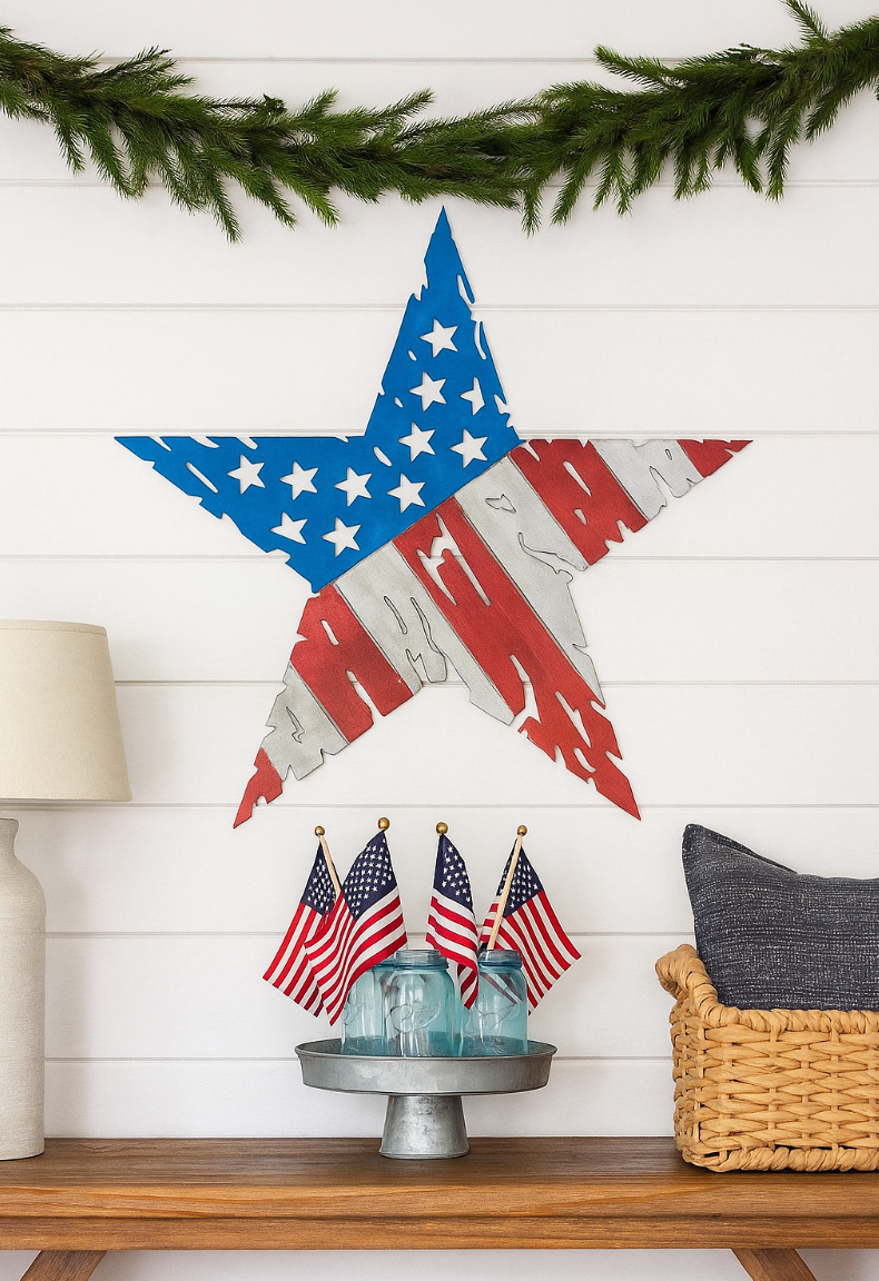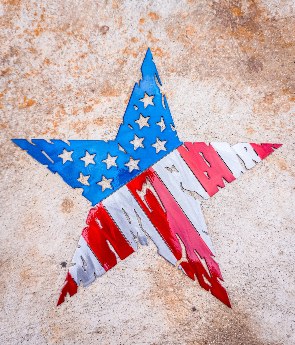 Celebrate freedom in full color with this American Flag Star Steel Sign — a rugged five-point star cut from steel and finished in distressed red, white, and blue with precision-cut stars and stripes. Whether you’re decking out your porch, garage, or backyard barbecue zone, this star delivers a blast of patriotic pride.