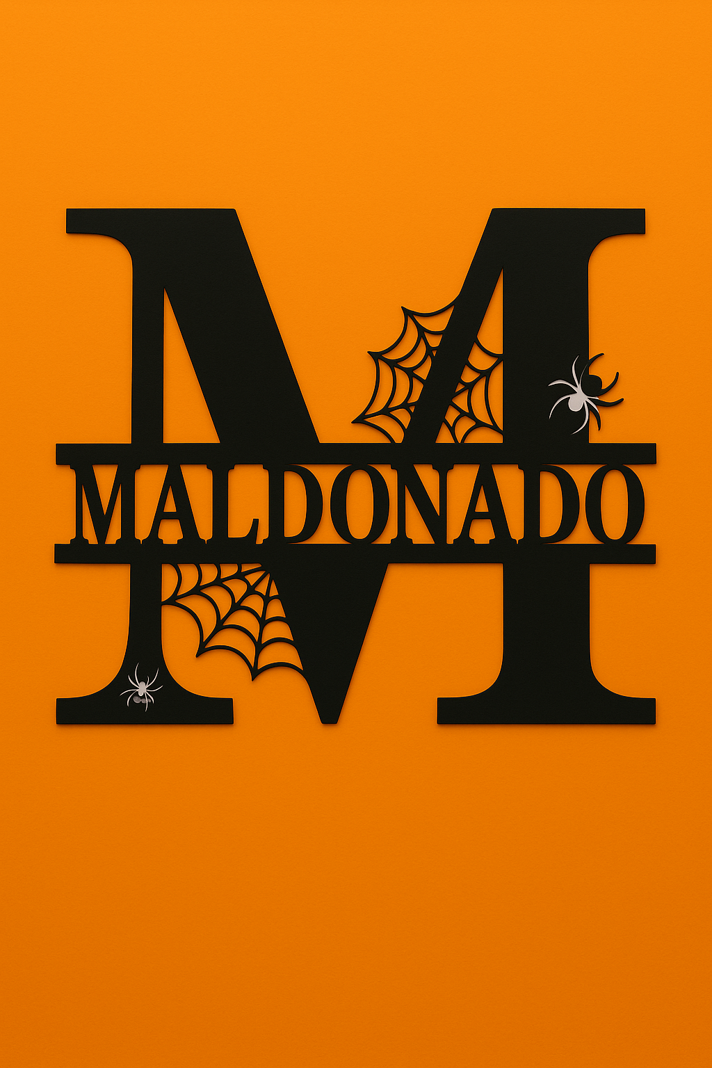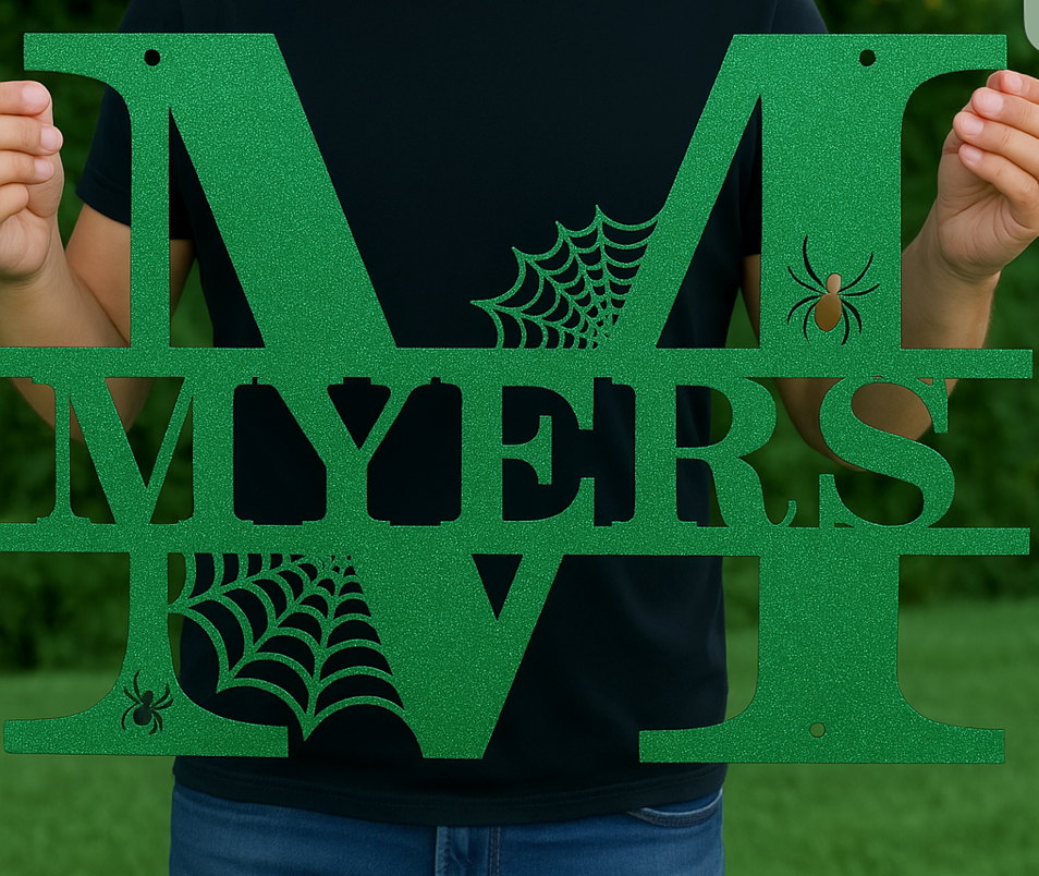 Add a creepy-cool twist to your Halloween decor with this personalized Spiderweb Monogram Name Sign! Featuring your family name and initial surrounded by laser-cut spiderwebs and spooky crawlers, this bold steel sign is perfect for front doors, porches, or party decor.