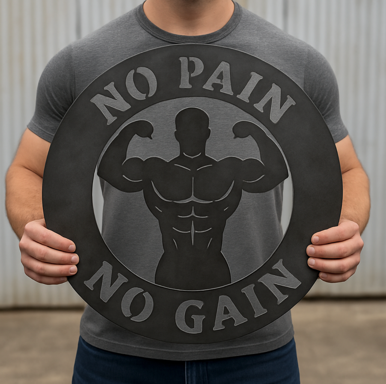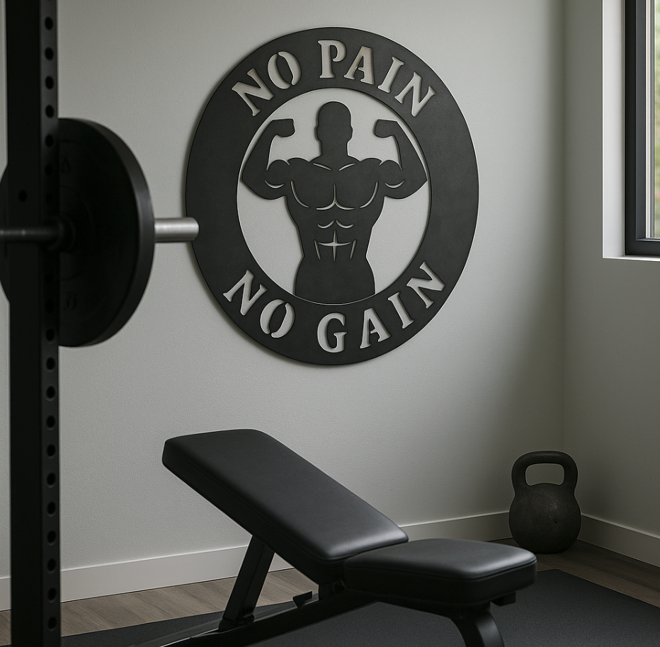 This laser-cut gym sign features a bold silhouette of a flexing bodybuilder surrounded by the legendary words: NO PAIN – NO GAIN. Cut from heavy-duty steel and powder coated in matte black, this piece is made for those who live by the grind — and never skip leg day.